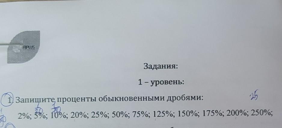 Задания: 1- уровень: 1) Запишите проценты обыкновенными дробями: 5 2%; 5%; 10%; 20%; 25%, 50%, 75%; 125%; 150%; 175%; 200%; 250%; ; ;