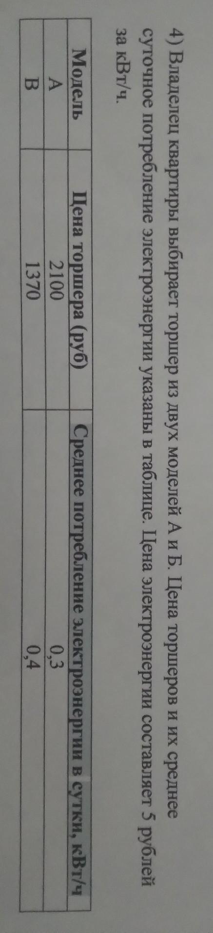 Разница в стоимости торшеров равна 2100 минус 1370=730 руб. Стоимость электроэнергии за сутки работы первого торшера равна 5 умножить на 0,3=1,5 руб. Стоимость электроэнергии за сутки работы второго торшера равна 5 умножить на 0,4=2 руб. Значит, при установке первого торшера владелец квартиры за сутки экономит 2 минус 1,5=0,5 руб. Следовательно, в год владелец квартиры экономит 0,5 умножить на 365=182,5 руб. Таким образом, экономия от меньшего расхода электроэнергии окупит разницу в цене этих торшеров через дробь, числитель — 730, знаменатель — 182,5 =4 года.