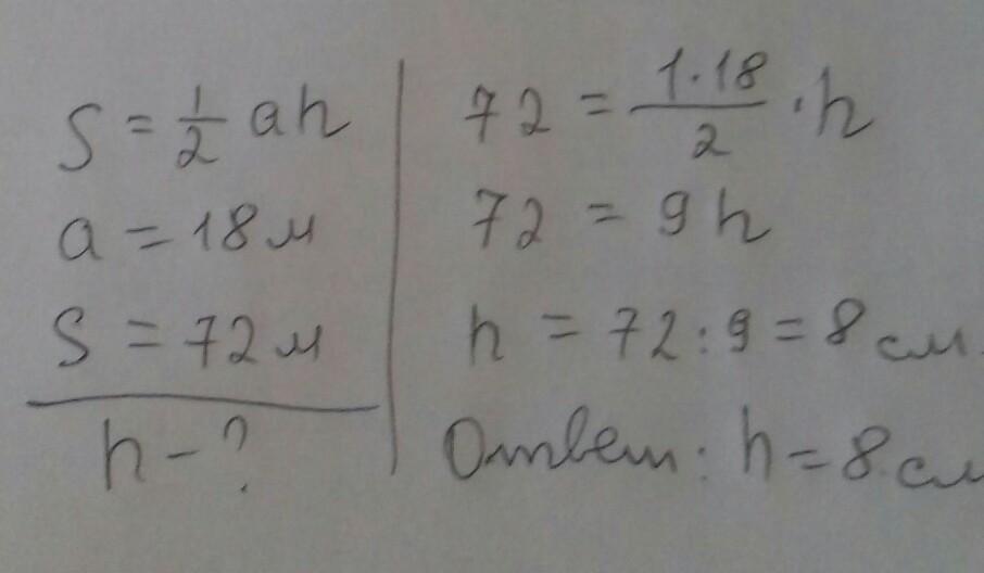 S =1/2аh, где S - площадь = 72 м², а - основание = 18 м