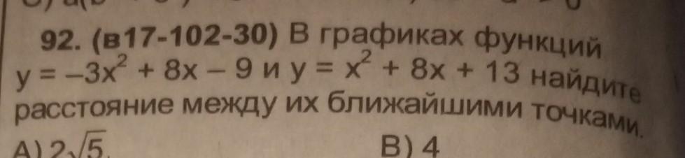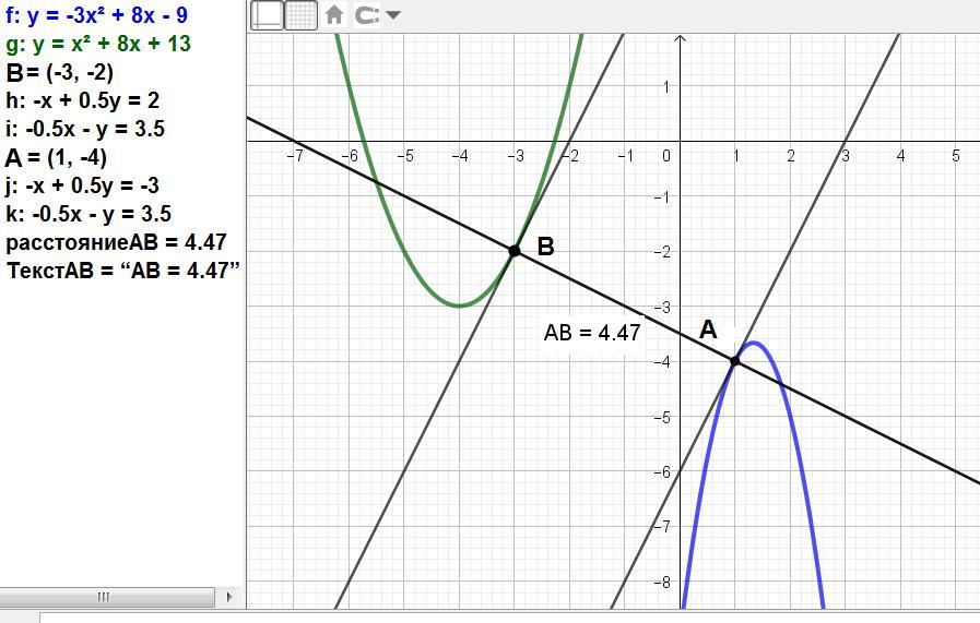 Предположим точки А и В самые близкие точки двух кривых. Из геометрических соображений, связанных с выпуклостью, ясно, что наименьшее расстояние между указанными точками достигается в том и только в том случае, если касательные к параболам в этих точках параллельны.