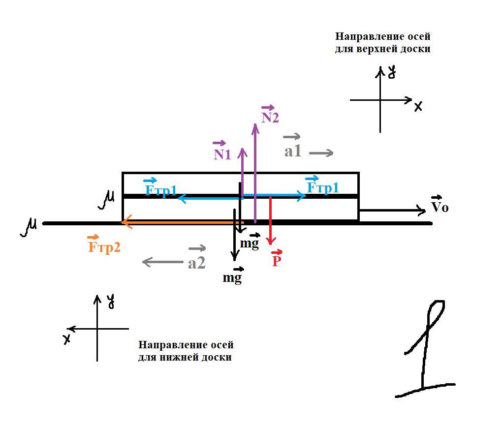 См. рисунок №1. После толчка на нижнюю доску по горизонтали действуют две силы: сила трения между поверхностью и нижней доской Fтр2 и сила трения между нижней доской и верхней Fтр1. Равнодействующая этих сил тормозит нижнюю доску.