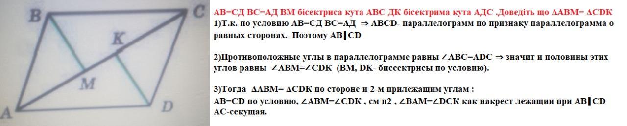 на рисунку АВ=СД ВС=АД ВМ бісектриса кута АВС ДК бісектрима кута АДС доведіть що трикутник АВМ= трикутнику СДК