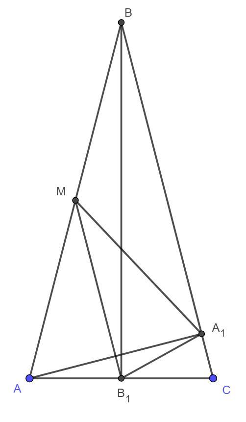 Поскольку AB = BC, то ΔABC - равнобедренный ⇒ BB₁ - высота, биссектриса и медиана ⇒ AB₁ = B₁C = AC/2 = 1. Поскольку точка M - середина AB, то AM = BM = AB/2 = 2.