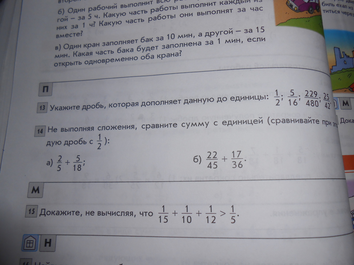 №14 не выполняя сложения,сравните сумму с единицей(сравнивайте при этом каждую дробь с 1-2-ых) а)2-5-ых+5-18-ых б)22-45-ых+17-36-ых