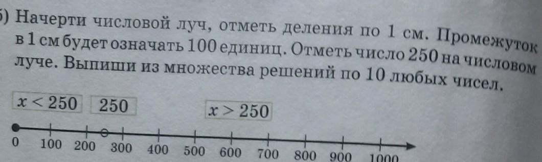 там где на линии кружок- это 250, у вас есть x<250 это значит что все числа которые меньше 250 это x, и есть у вас число x>250 это значит что все числа которые больше 250 это x, вам нужно отметить 10 любых чисел которые будут "250" "x<250" и "x>250" например 5-чисел х<250 4-х>250 и 1-250 (скорее всего так)