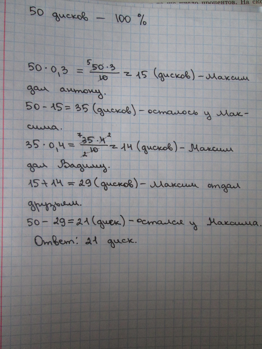 Теперь, так как Антону он дал 0,3 этого кол-ва, а Вадиму 0,4, значит 0,3+0,4 = 0,7 он отдал и Антону и Вадиму. А теперь просто умножь 50 на 0,7=35 дисков он отдал им обоим..