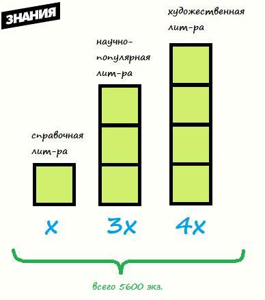 Пусть x - это кол-во экземпляров справочной литературы. Тогда 3x - количество экземпляров научно-популярной литературы, 4x - количество экземпляров художественной литературы. Всего в библиотеке 5600 книг.