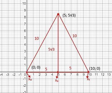 определите координаты вершин равностороннего треугольника,лежащего в 1 квадранте со стороной равной 10 если вершина с началом координаты 0 а основание на ох