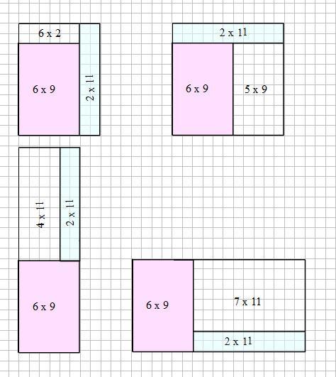 Буратино взял клетчатый картонный прямоугольник и разделил его на три прямоугольные части. Оказалось, что одна часть имеет размеры 6 × 9 клеток, другая — 2 × 11 клеток. Какими могут быть длина и ширина третьей части? Перечислите все возможные варианты.
