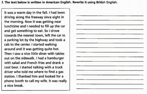 Был теплый осенний день, ехал по автостраде с восьми утра. Теперь приближалось время обеда, и мне нужно было заправить машину на стоянке у шоссе, и я взял такси до центра. Я начал ходить, и стало довольно жарко. Потом я увидел симпатичную маленькую закусочную со столиками на тротуаре. Я съел гамбургер с салатом и картофелем фри и выпил прохладного пива. Я начал разговаривать с водителем грузовика, который сказал мне, где найти заправку. Я поблагодарил его и стал искать телефонную будку, чтобы позвонить жене. Это был действительно хороший перерыв.