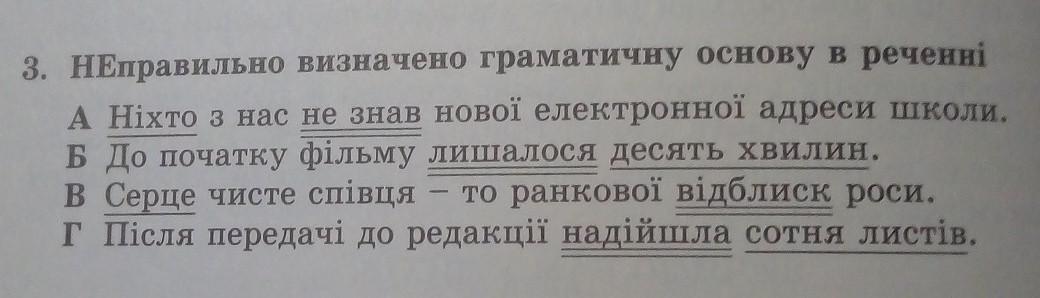 НЕправильно визначено граматичну основу в реченні А – Ніхто ( ___ ) з нас не знав ( ‗‗‗‗ ) нової електронної адреси школи.