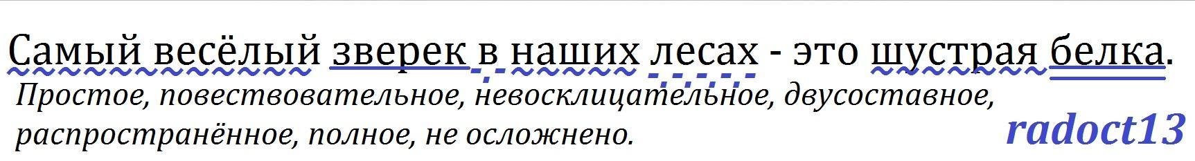 Самый весёлый (какой? определение, выражено прилагат., подчёркиваем волнистой линией) зверёк (кто? подлежащее, выражено сущ., подчёркиваем 1 чертой) в (предлог, берем в треугольник) наших (в чьих? определение, выражено местоим., подчёркиваем волнистой линией) лесах (где? обстоятельство места, выражено сущ., подчёркиваем точка тире) – это шустрая (какая? определение, выражено прилагат., подчёркиваем волнистой линией) белка (есть кто? сказуемое, выражено сущ., подчёркиваем 2 чертами).