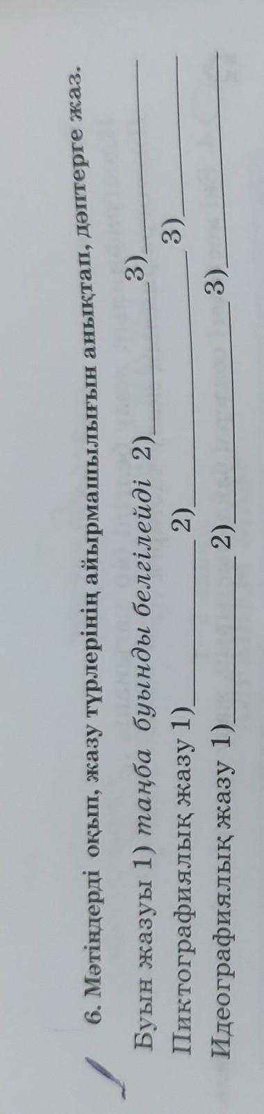 6. Мәтіндерді оқып, жазу түрлерінің айырмашылығын анықтап, дәптерге жаз. Буын жазуы 1) таңба буынды белгілейді 2) 3) Пиктографиялық жазу 1) 2) 3) Идеографиялық жазу 1). 2) 3)