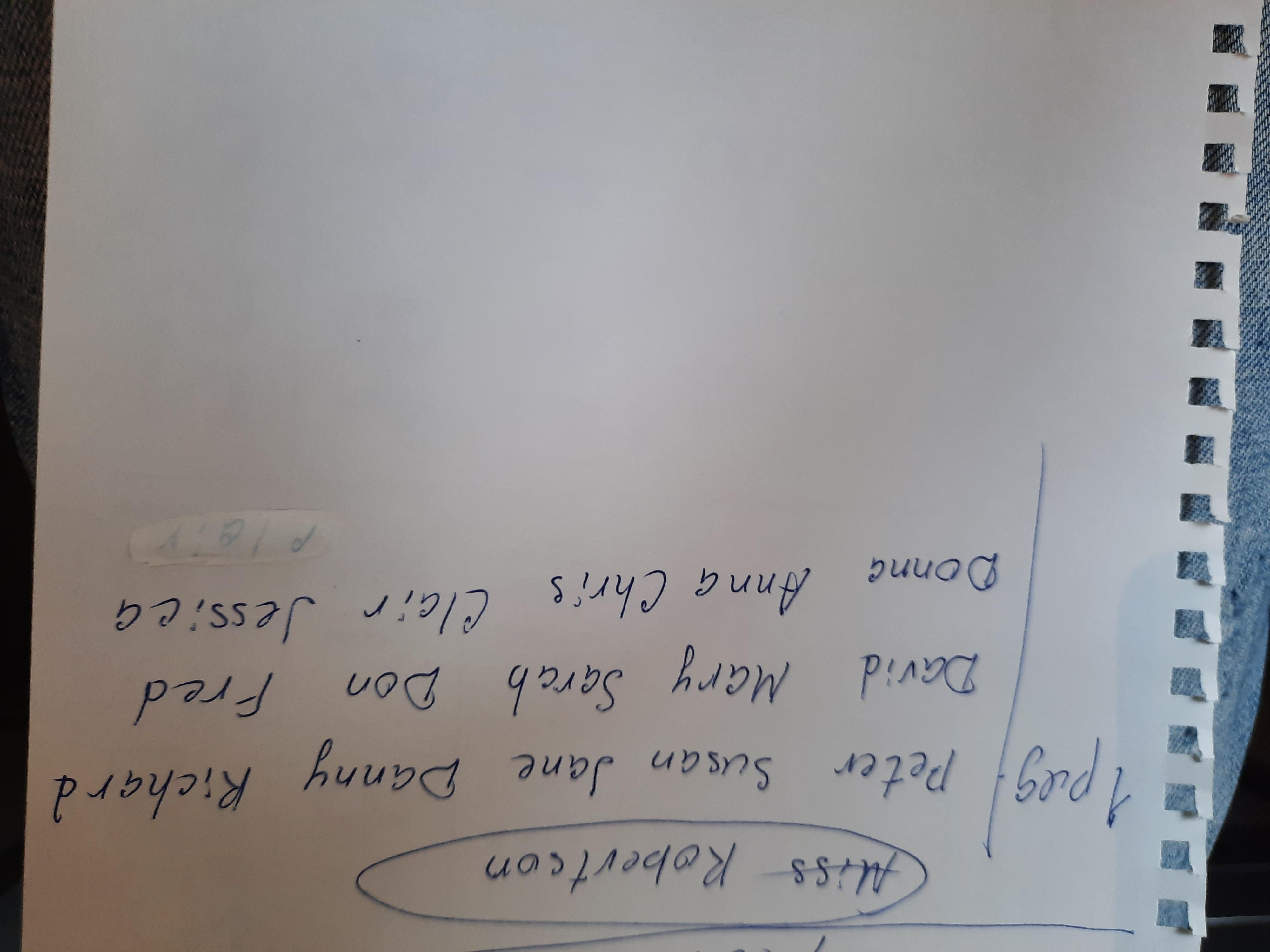Miss Robertson is arranging the seating in her classroom. Susan is in the front of row. She is between Jane and Peter. Danny is to the right of Jane and to the left of Richard. Mary is behind Susan; they are good friends. Mary's other friend Sarah is next to her. Sarah has Don next to her. Don's friend Fred is next to him. Mary is on David's right. Donna is at the back next to her friend Claire. Claire is next to Jessica, who is behind Fred. Donna has Anna on her left and Anna is on Chris' right.