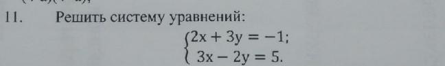 \left\{\begin{array}{l}2x+3y=-1\ |\cdot 3\\3x-2y=5\ |\cdot (-2)\end{array}\right\ \oplus \ \left\{\begin{array}{l}2x+3y=-1\\13y=-13\end{array}\right\ \ \left\{\begin{array}{l}2x=-3y-1\\y=-1\end{array}\right\\\\\\\left\{\begin{array}{l}2x=2\\y=-1\end{array}\right\ \ \left\{\begin{array}{l}x=1\\y=-1\end{array}\right\\\\\\Otvet:\ \ (1;-1)\ .