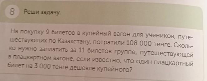 1)108 000:9=12 000 (тенге ) стоимость купейного билета