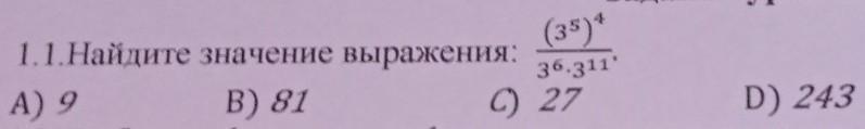 (3^5)^4 / (3^6 * 3^11) = 3^20 / 3^ 17 = 3^3 = 27