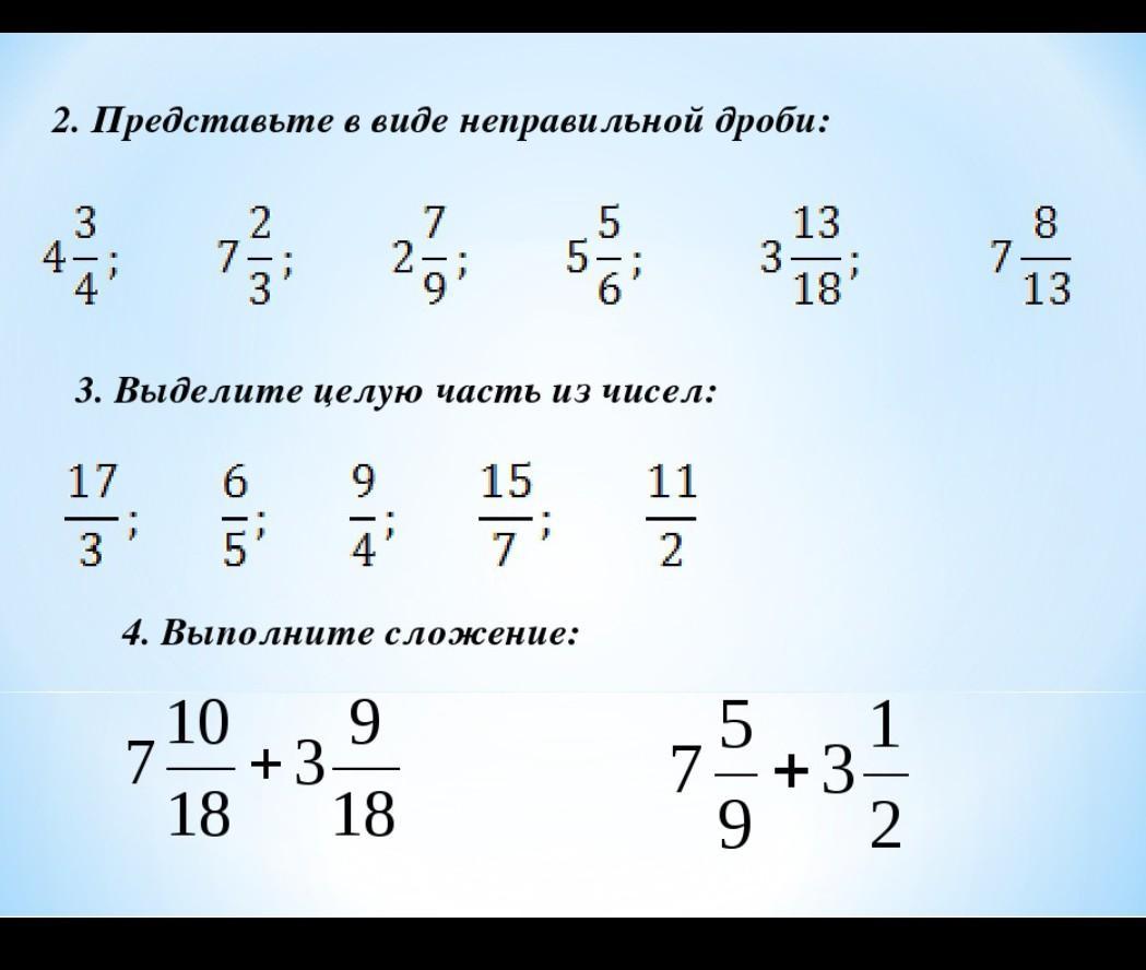 чтобы перевести в неправильную дробь нужно знаменатель умножить на целую часть и прибавить числитель. Например, 4 3/4 = 4*4+3 = 19/4
