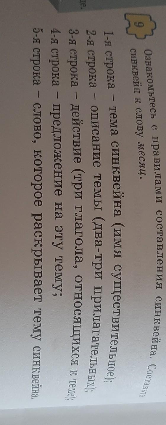 Ознакомьтесь с правилами составления синквейна. Состатом 9 синквейн к слову месяц. 1-я строка - тема синквейна (имя существительное 2-я строка - описание темы (два-три прилагательных 3-я строка – действие (три глагола, относящихся к теми 4-я строка - предложение на эту тему; 5-я строка - слово, которое раскрывает тему синквейна.