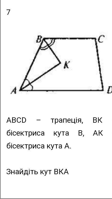 Сумма углов ДАВ + АВС = 180. Поскольку углы ДАК = КВА и АВК = КВС, то сумма КАВ = АВК = 90. Значит ВКА = 90.