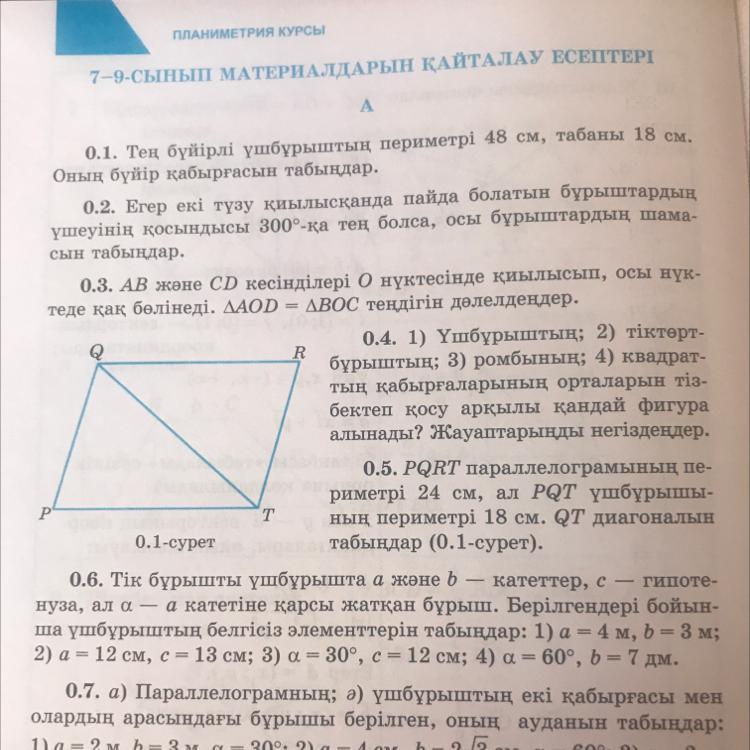 Обоснуйте свои ответы 0.5. Периметр параллелограмма PQRT равен 24 см, а периметр треугольника PQt равен 18 см. Найдите диагональ QT (рис. 0.1).