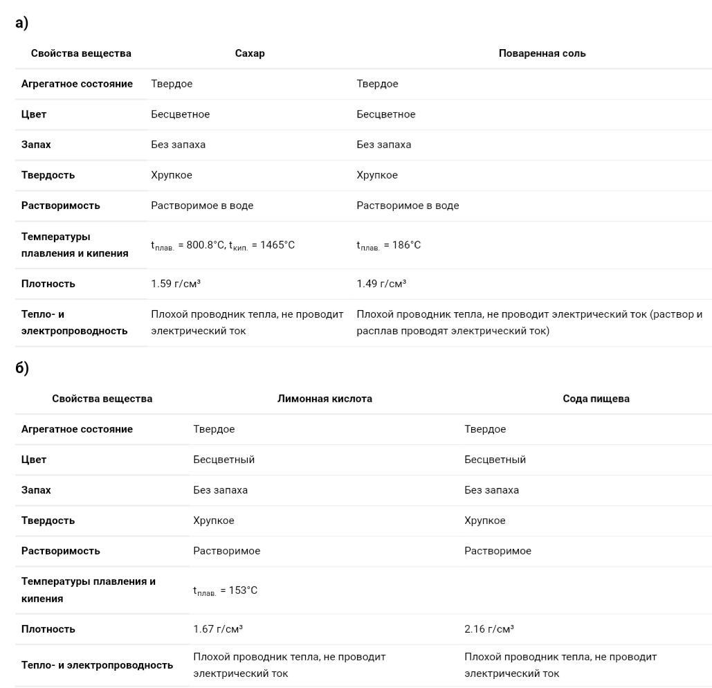 изучите физические свойства: а) сахара и соли; б) лимонной кислоты и соды. для определения температуры плавления и кипения веществ используйте интернет. результаты проведенного анализа оформите в виде таблицы