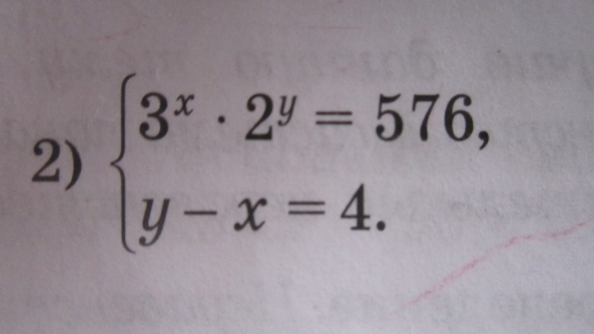 576 это два в шестой умноженное на 3 в квадрате т.е. 576=2^6*3^2. отсюда х равен степени тройки а у равен степени двойки т.е.х=2 у=6. подставляешь для проверки во второе уравнение 6-2=4 совпадает значит правильно