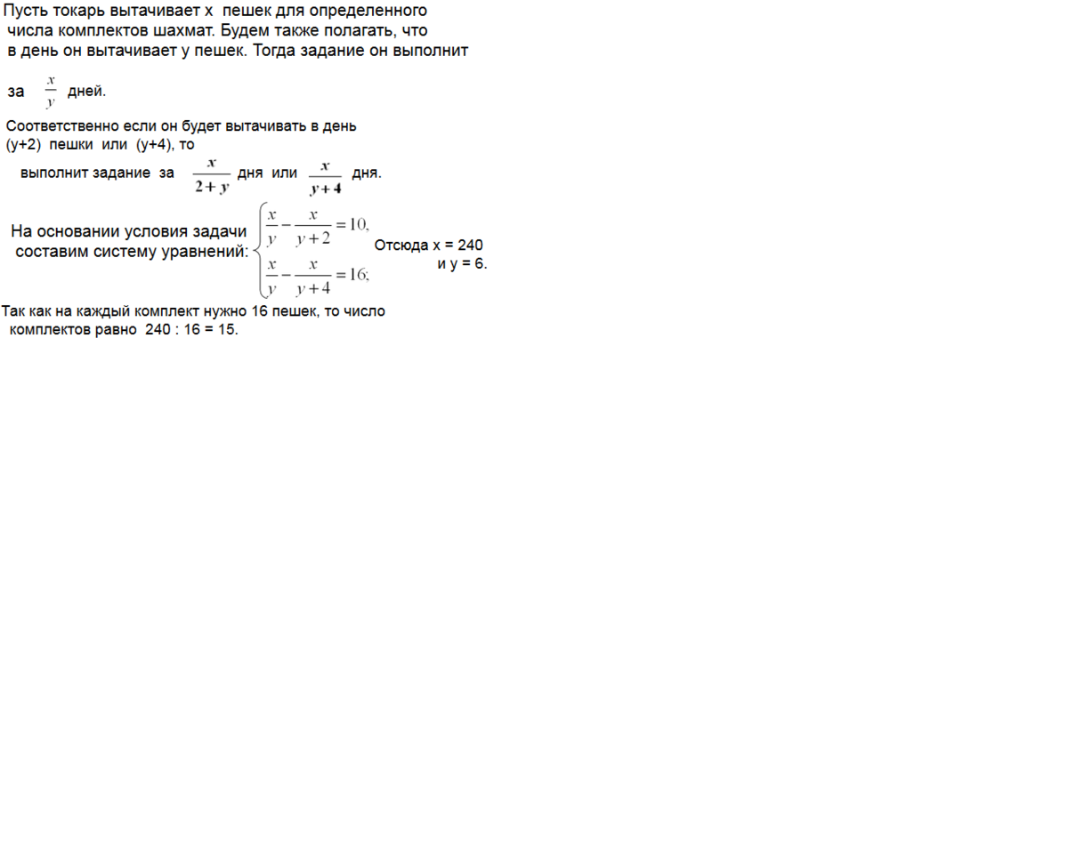 Ученик токаря вытачивает шахматные пешки для определенного числа комплектов шахмат. Он хочет научиться изготовлять ежедневно на 2 пешки больше, чем теперь; тогда такое же задание он выполнит на 10 дней быстрее. Если бы ему удалось научиться изготовлять ежедневно на 4 пешки больше, чем теперь, то срок выполнения такого же задания уменьшился бы на 16 дней. Сколько комплектов шахмат обеспечивает пешками этот токарь, если для каждого комплекта нужно 16 пешек.