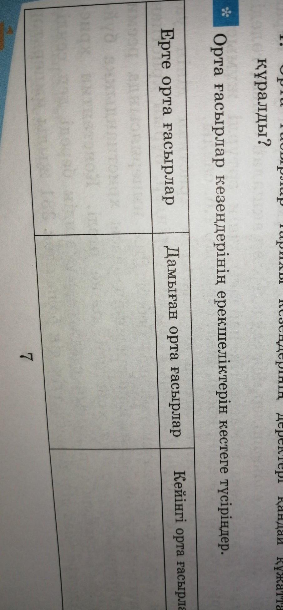 Ответ:ерте орта ғасырлар:бұл кезеңде феодалдық кезеңнен тұрады.кейінгі орта ғасыр: феодализмнің ыдырауымен және капиталистік өндіріс тәсілінің туа бастауымен сипатталады.