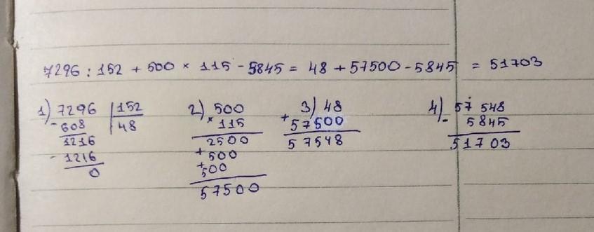 7296 : 152 + 500 × 115 - 5845 = 51703