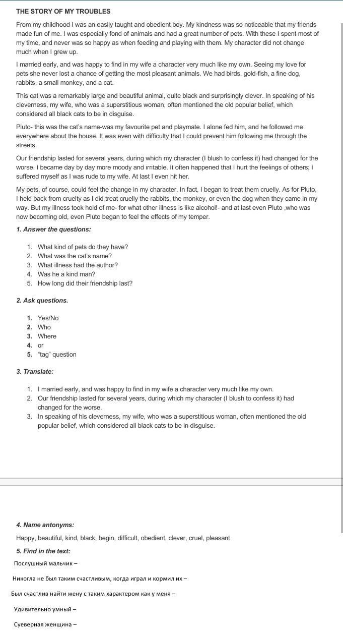 3. Говоря о его сообразительности, моя жена, которая была суеверной женщиной, часто упоминала старое популярное убеждение, в котором считалось, что все чёрные кошки замаскированы.
