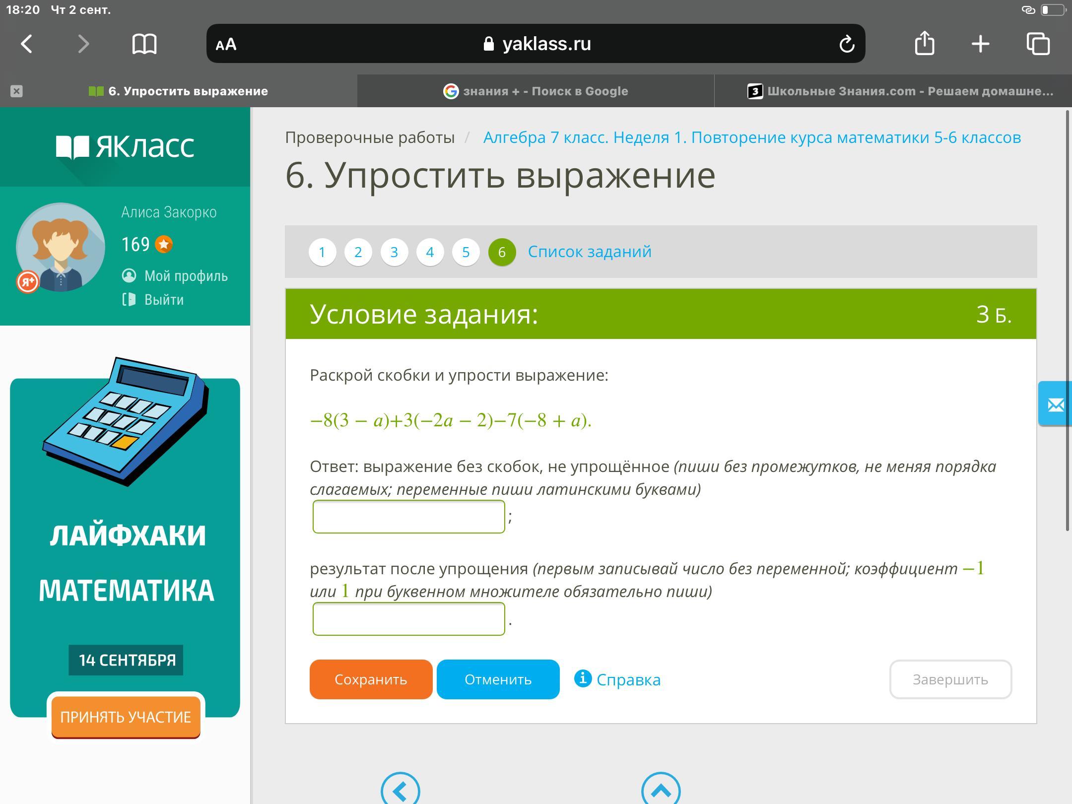 результат после упрощения (первым записывай число без переменной; коэффициент −1 или 1 при буквенном множителе обязательно пиши)