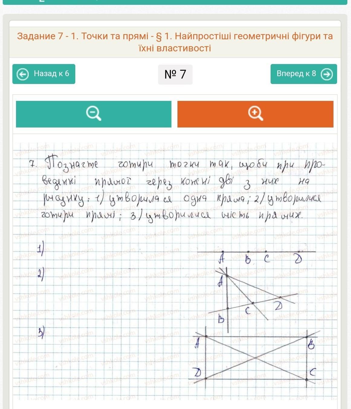 Позначте чотири точки так, щоби проведенні прямої через кожні дві з них на рисунку: 1) утворилася одна пряма; 2) утворилися чотири прямі; 3) утворилися шість прямих. Проведіть ці прямі