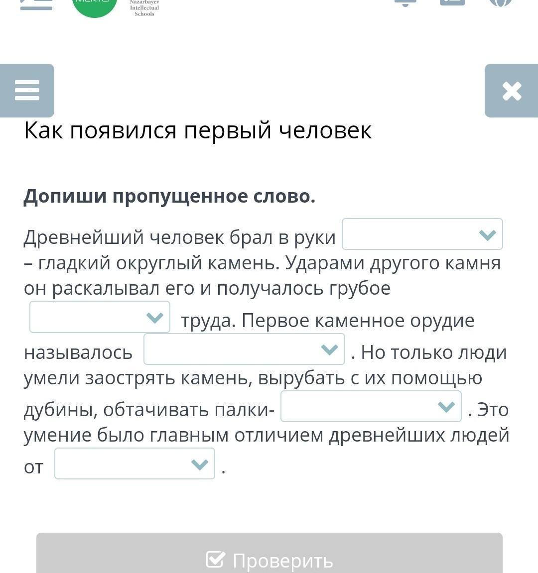 Допиши пропущенное слово. Древнейший человек брал в руки – гладкий округлый камень. Ударами другого камня он раскалывал его и получалось грубое труда. Первое каменное орудие называлось . Но только люди умели заострять камень, вырубать с их помощью дубины, обтачивать палки- . Это умение было главным отличием древнейших людей от . Назад Проверить