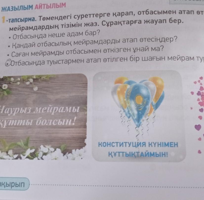 ЖАЗЫЛЫМ АЙТЫЛЫМ 1-тапсырма. Төмендегі суреттерге қарап, отбасымен атап өтетін мейрамдардың тізімін жаз. Сұрақтарға жауап бер.