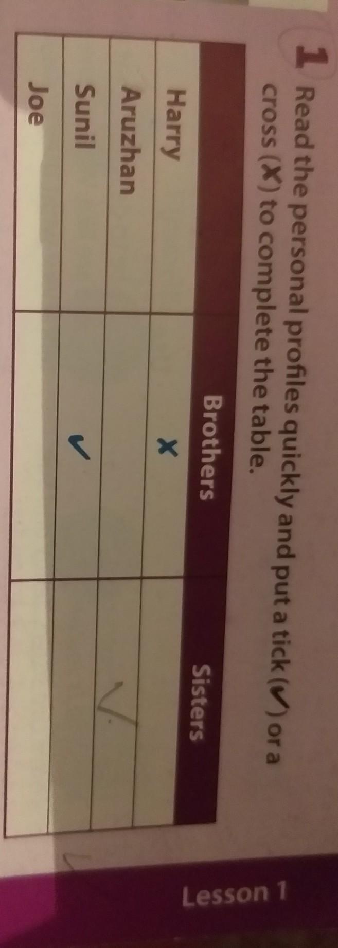 1 Read the personal profiles quickly and put a tick (ora cross (X) to complete the table. Brothers Sisters Harry Х Aruzhan Sunil Joe