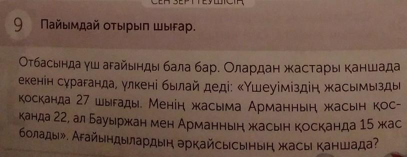 Қадамдық түсініктеме: Егер олардың барлығы 27 жаста болса және Ақсақал мен Арман бірге 22 жаста болса, онда Бауыржан 5 жаста (27-22 = 5). Егер Бауыржан екеуміз 15 жаста болсақ, онда Арманд 10 жаста (15-5 = 10) Үлкені 12 жаста (27-15 = 12)
