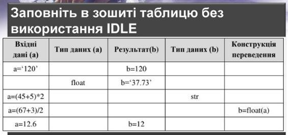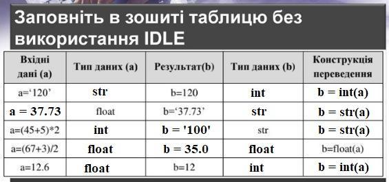 a=12.6; тип: float; b=12; тип: int; конструкция: b=int(a)