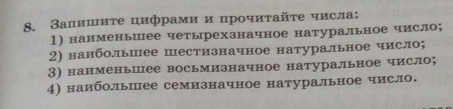 Пошаговое объяснение: Самое наименьшее число это 1, значит и в 2 3 4 5 6 7 8 9 и т.д значных числах самое наименьшее число будет начинаться с 1 заканчивая 0.
