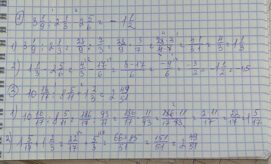 1) 3 1/9 : 2 1/3 - 2 5/6= 28/9 : 7/3 - 2 5/6 = 28/9 * 3/7 - 2 5/6 = 4/3 - 2 5/6=
