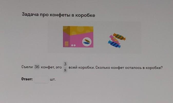 1). 36:3/8=36/1*8/3=104/1=104(к)- было в коробке.