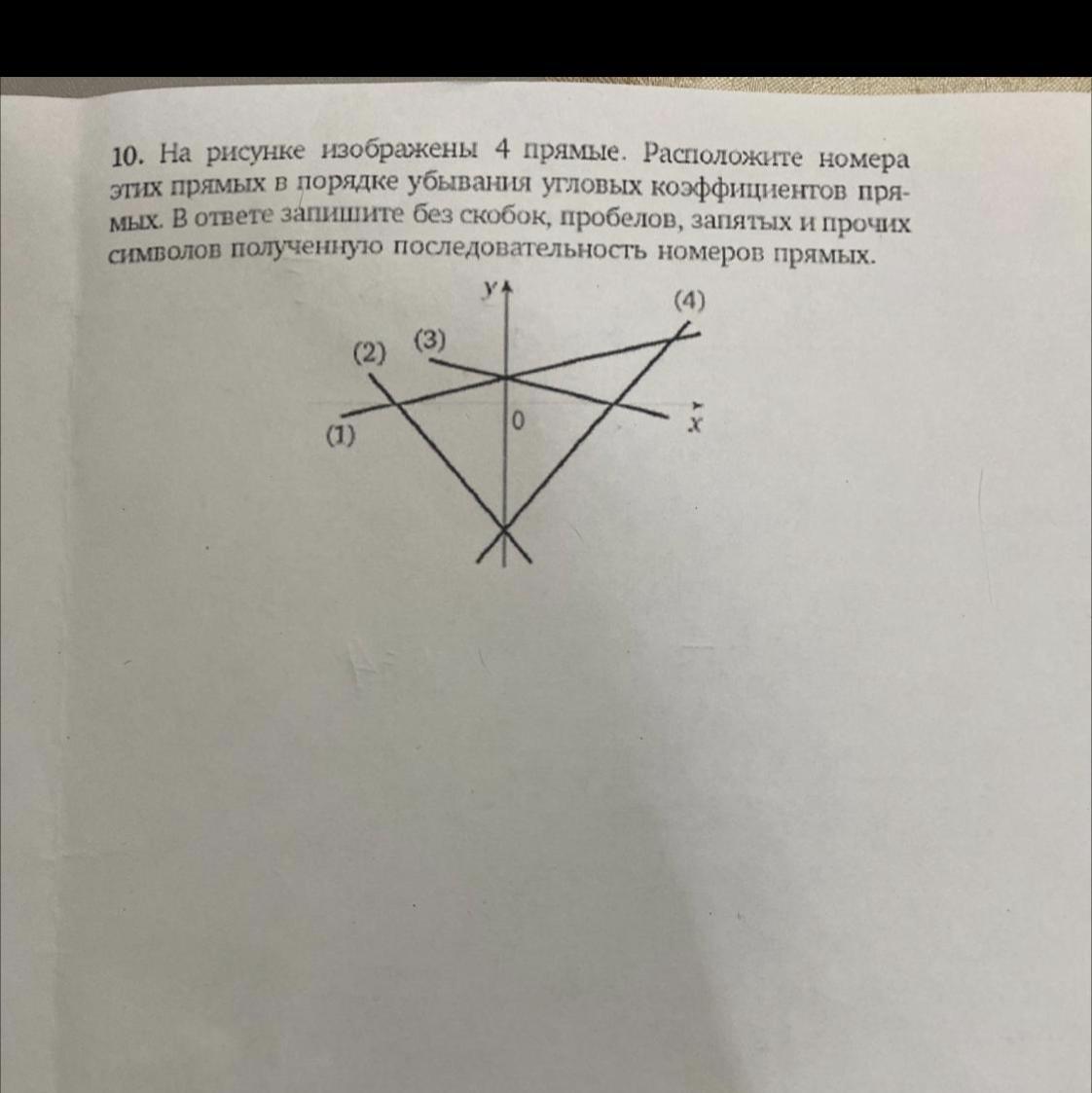 угловой коэфф. равен тангенсу между прямой и абсциссой. Если прямая возрастает, то коэфф. больше 0. Если убывает, то меньше 0. Если параллельна абсциссе, то коэфф. равен 0. Если параллельна ординате, то коэфф. обращается в бесконечность или не существует. Прямая 4 и 1 возрастают. У прямой 4 угол больше чем 1. Остальные убывают. К ним подход противоположный. У прямой 2 угол меньше чем 3. Значит угловой коэфф. меньше у 3