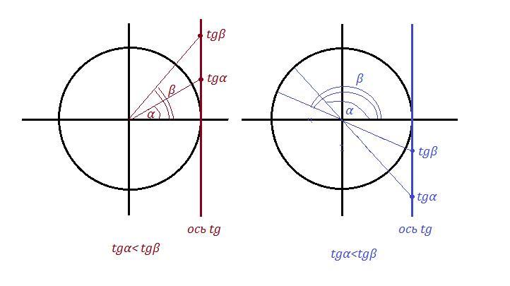 Все острые углы α имеют положительный tgα>0 , а тупые углы - отрицательный tgα<0 .