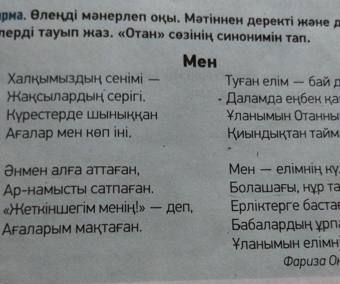 Халқымыздың сенімі Жақсылардың серігі. Күрестерде шыныққан Ағалар мен көп іні. Мен Туған елім - бай далам, Даламда еңбек қайнаған. Ұланымын Отанның Қиындықтан таймаған. Әнмен алға аттаған, Ар-намысты сатпаған. «Жеткіншегім менің!» - деп, Ағаларым мақтаған. Мен - елімнің күлкі, әні, Болашағы, нұр таңы. Ерліктерге бастаған Бабалардың ұрпағы Ұланымын елімнің! Фариза Оңғарсынова Арена помогите пожалуйста!