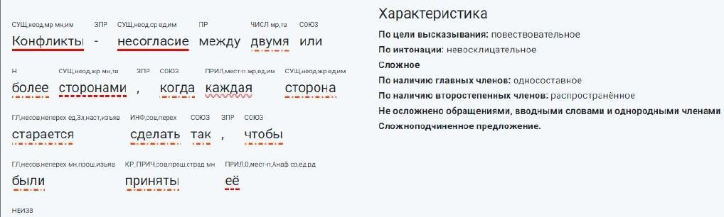 Помогите выполнить синтаксический разбор предложения . Конфликты - несогласие между двумя или более сторонами, когда каждая сторона старается сделать так, чтобы были приняты её взгляды