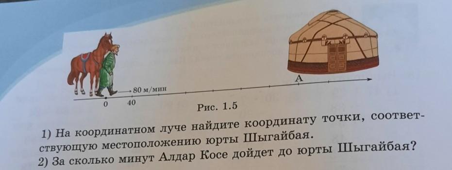 23. Алдар Косе идет к юрте Шыгайбая со скоростью 80 м/мин (рис. 1.5). На координатном луче юрте Шыгайбая соответст- вует точка А. Длина единичного отрезка равна 40 м.