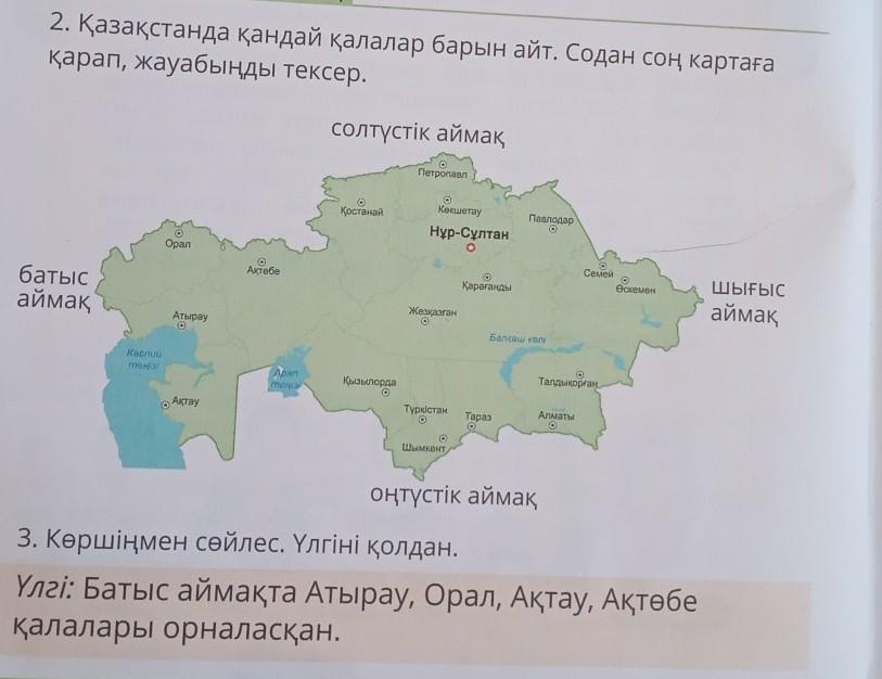 2. Қазақстанда қандай қалалар барын айт. Содан соң картаға қарап, жауабыңды тексер.