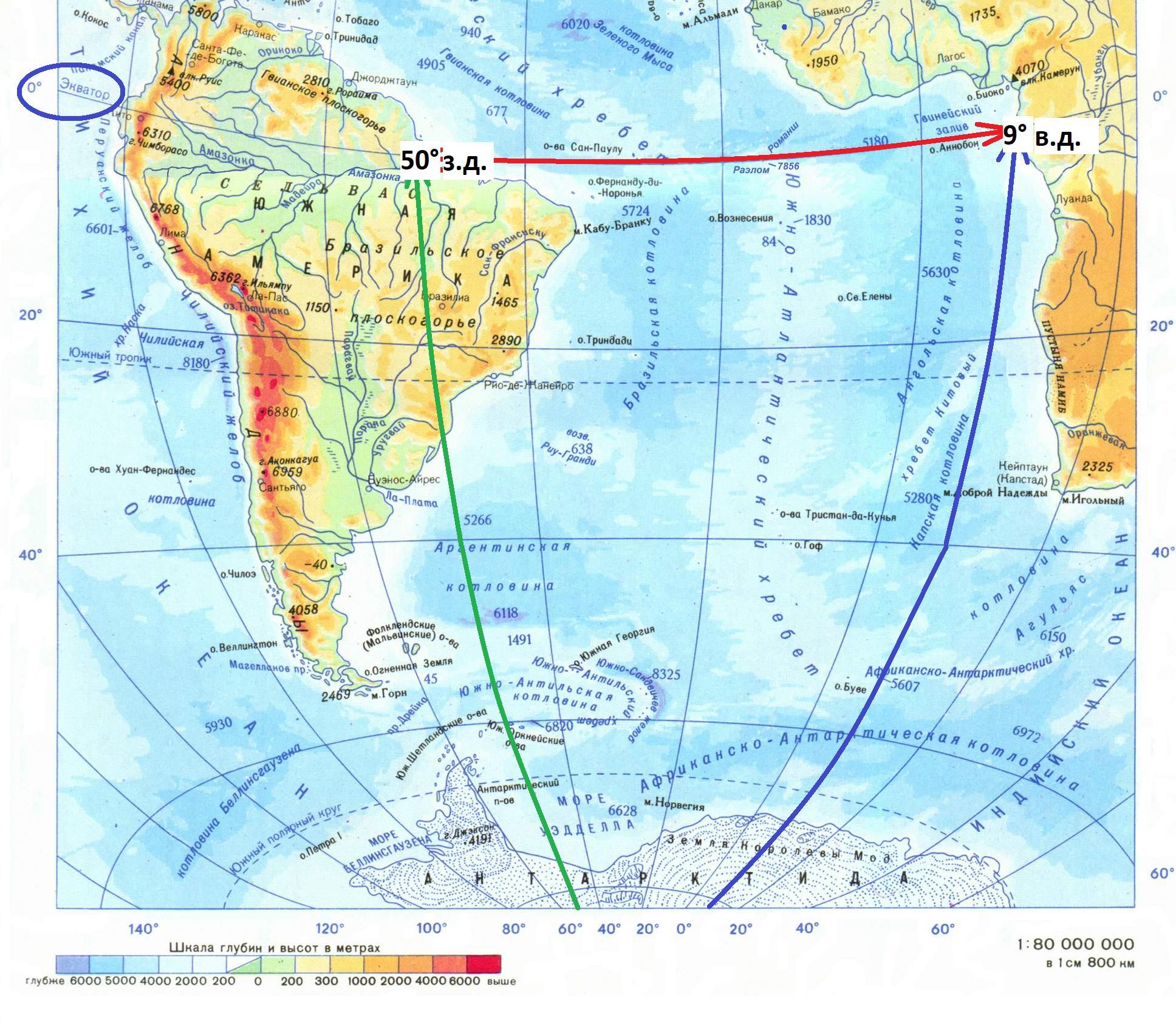 Выделим отрезок 0° ш. в пределах Атлантического океана и определим градусы конечных точек океана на данной параллели.