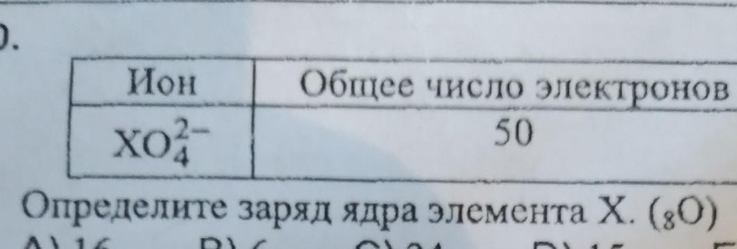 q = e⁻ - (₈O)×4 - (ион XO₄²⁻) = 50 - 8×4 - 2 = 50 - 32 - 2 = 16