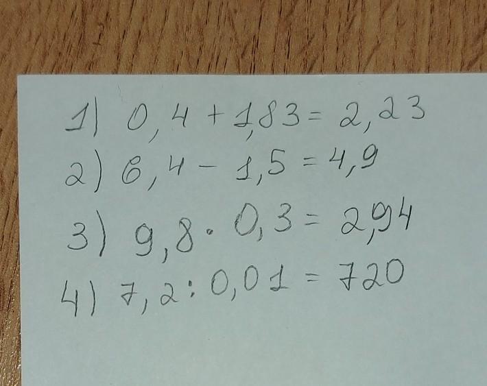 А 20. Приведите обыкновенные дроби в десятичные и найдите значение выражений: 1) 2/5 + 1, 83; 2) 6, 4 - 3/2; 3) 9, 8 * 3/10; 4) 7, 2 : 1/100.